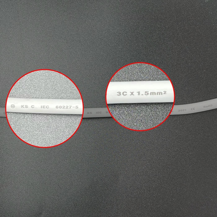 이는 전선 내부에 세 가닥의 도체가 있으며, 각 도체의 단면적이 1.5제곱밀리미터임을 의미합니다. 이 규격은 IEC 및 KS 기준에서 16A급 이동형 전원 케이블에 일반적으로 요구되는 최소 사양입니다.