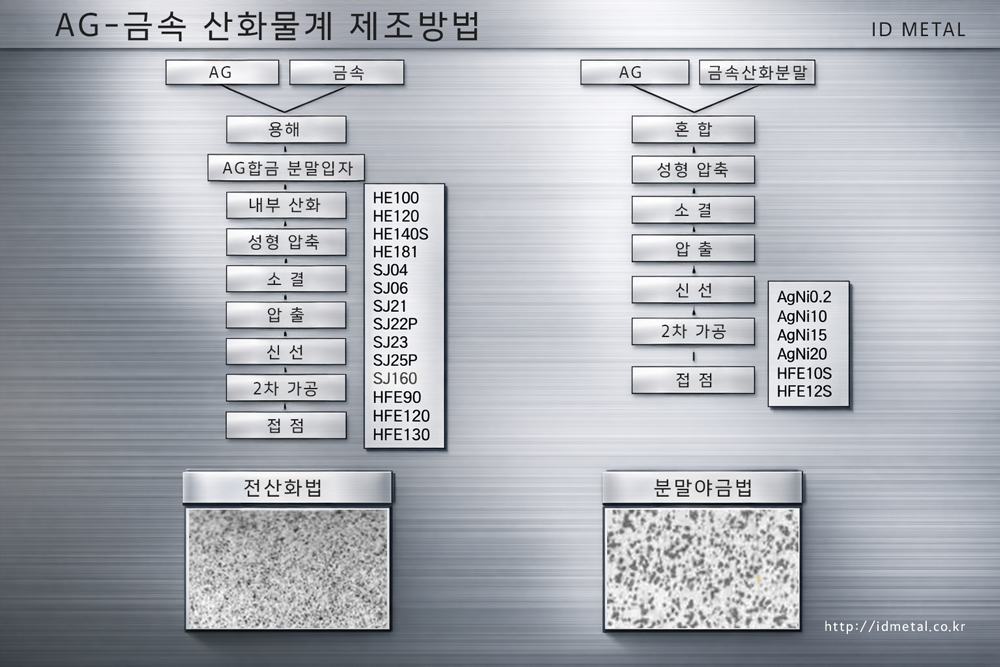 • 전산화(Internal Oxidation)는 합금 내부에서 SnO₂가 형성되어 치밀한 Ag 매트릭스와 강한 계면 결합이 형성되는 경향이 있습니다.