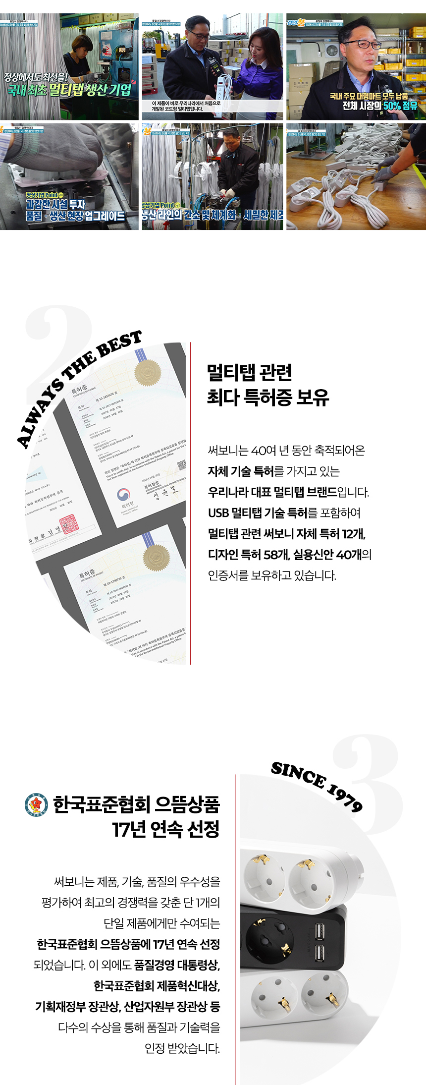 반면 써보니 subony 멀티탭은 국내 생산 공장에서 직접 제조되며, 1979년부터 46년간 멀티탭만을 연구하고 만들어온 회사의 제품입니다. 설계부터 사출, 조립, 검사까지 한 흐름 안에서 관리되기 때문에, 장시간 사용을 전제로 한 만듦새가 다릅니다. 이 차이는 오래 사용할수록 분명해집니다.
