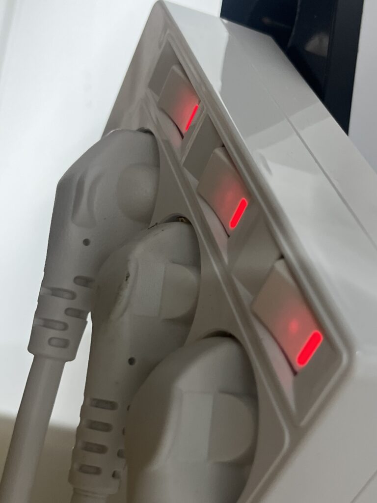 노트북 어댑터, 모니터, 스탠드처럼 전원 주기가 다른 기기를 각각 스위치로 분리하면 조작이 간단해집니다. 특히 케이블이 바닥으로 내려가지 않아 시각적으로 정돈된 구성이 됩니다.